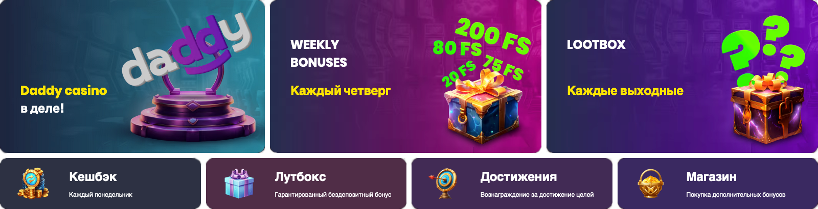 Новые клиенты Daddy casino могут активировать стартовый пакет бонусов для увеличения своего первого депозита и получения дополнительных фриспинов. Постоянные посетители онлайн-площадки имеют возможность каждую неделю пользоваться депозитными бонусами и привилегиями участника программы лояльности casino. Чем выше клубный ранг игрока, тем больше доступно ему преимуществ. Например, увеличенный процент кэшбэка, повышенные лимиты на выплату, доступ к эксклюзивным турнирам.